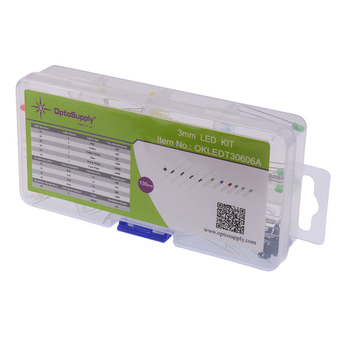 What's in the box?60pcs 3mm LEDs (red, yellow, blue, green, warm white, cool white) 60pcs 0.25W carbon film resistors (220r, 470r, 680r, 1K) 10pcs 3mm mounting clips