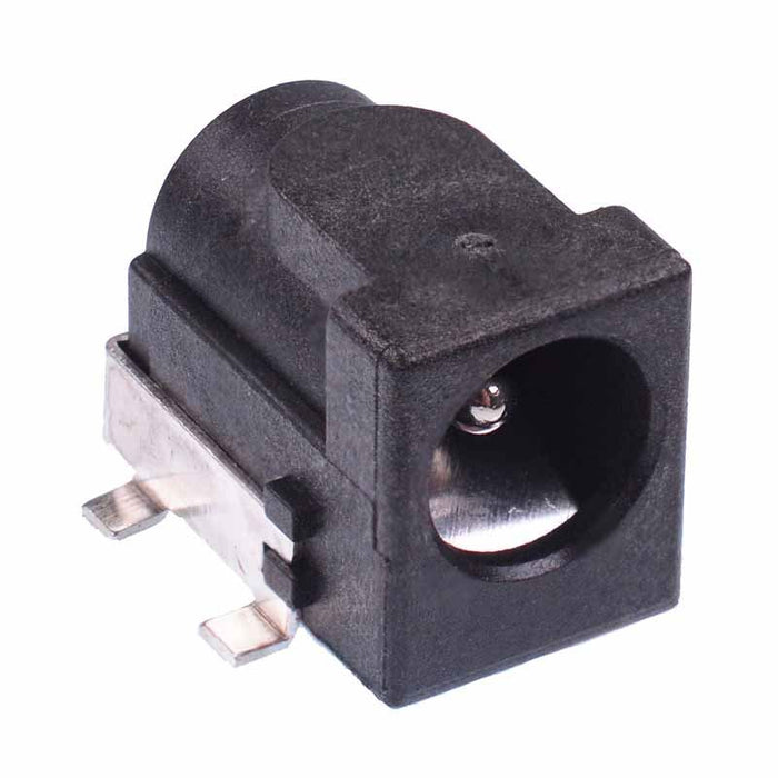 DC power jack connector featuring a 2.1mm center pin suitable for mounting horizontally to a PCB.