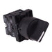Black industrial 2 position selector switch featuring 1NO1NC contacts, suitable for 22mm panel cut-outs. The switch features 10A rated contact blocks and is terminated using the screw terminals. The switch is suitable for a wide range of industrial applications.