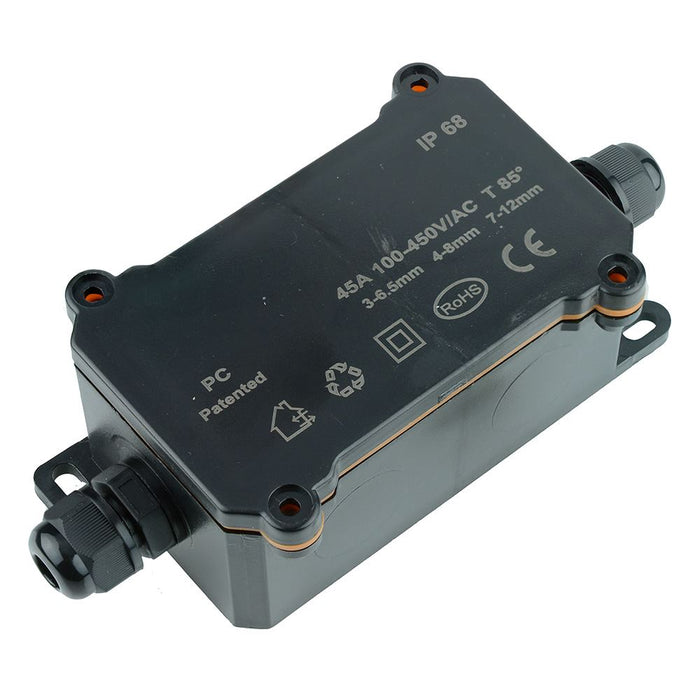 Waterproof junction box featuring 2 cable entries, suitable for indoor and outdoor applications to extend or repair existing wires.