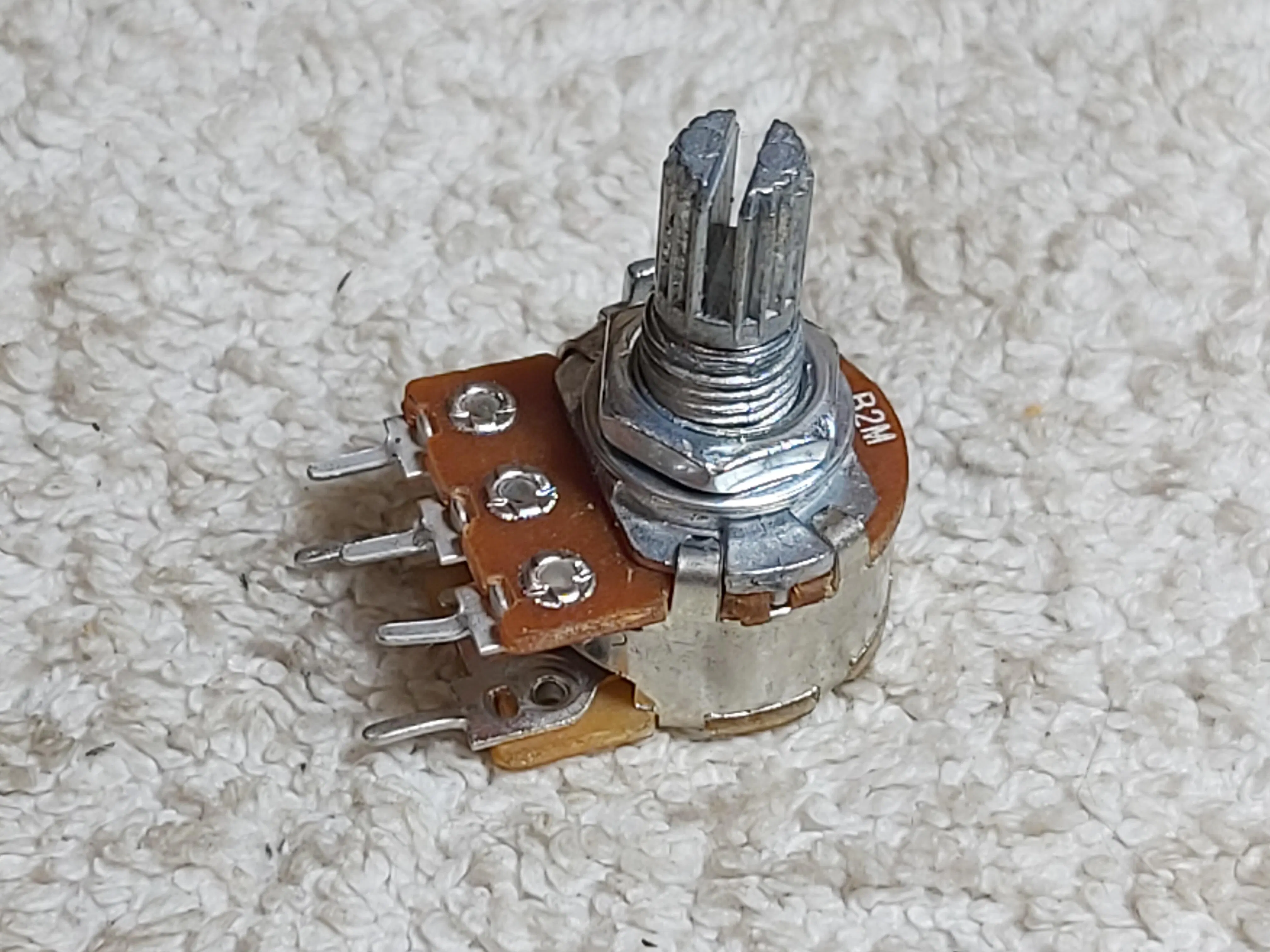 2M linear 16mm potentiometers featuring a splined 6mm shaft and switch suitable for PCB mounting.