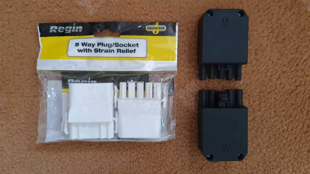 Male and female 5 pole lighting connector featuring a locking latch, manufactured from tough polyamide 66 suitable for use with 5 core round cable.