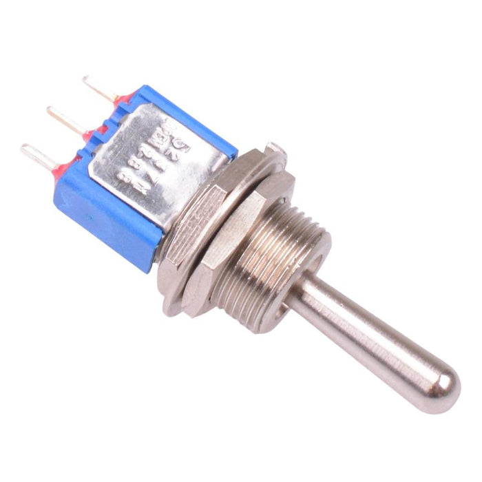 The 5237MAB is a miniature toggle switch featuring (On)-Off-(On) SPDT contacts, from the APEM 5000M series of switches. The switches feature PCB terminals and 11.9mm threaded bushing, making them suitable for a wide range of applications requiring a reliable switch in a compact package.