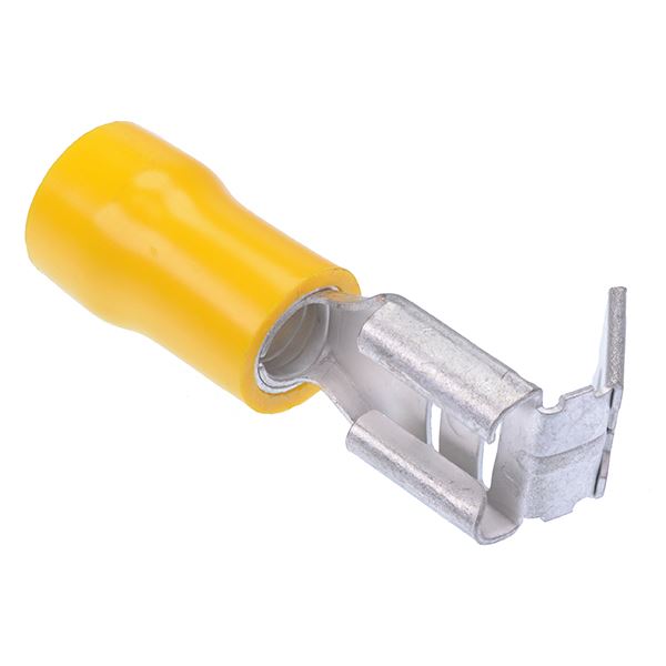 Yellow 6.3mm piggyback crimp terminals featuring nylon insulation and tin plated copper contact material. The connectors feature a double crimp which makes the pull out strength far superior than regular terminals.