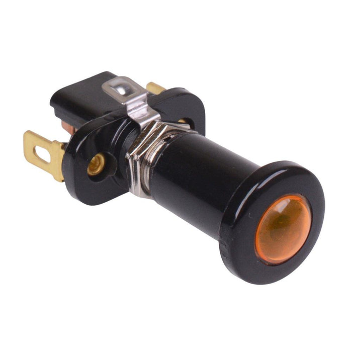 A3-7A-01 circular push-pull switch featuring a amber LED and Off-On operation. The switch features quick connect terminals and requires a 12.2mm cut-out, suitable for automotive and other 12V applications.