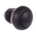 Black latching push button switch featuring a round actuator and SPST contacts. The switch features IP65 protection rating and is suitable for mounting in 12mm diameter cut-outs. The switch is suitable for a wide range of applications including automotive, control panels, industrial, appliances etc.
