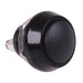 Black momentary push button switch featuring a round actuator and normally open contacts. The switch features a zinc alloy housing and is suitable for mounting in 12mm diameter cut-outs. The switch is suitable for a wide range of applications including automotive, control panels, industrial, appliances etc.