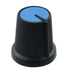 Low cost control knob with blue indicator on the top, suitable for 6mm splined shafts.