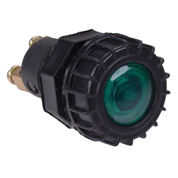 Green panel indicator featuring screw terminals and filament bulb suitable for 12V applications. The indicator requires a 17mm panel cut-out and is ideally suited for use with cars and vehicles.