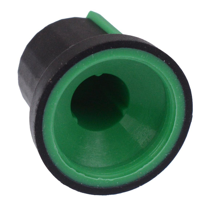 CLIFF K87MAR black control knob with a green indication line and moulded colour top. The knob has a rubberised soft-touch feel and is suitable for use with 6mm diameter splined shafts.