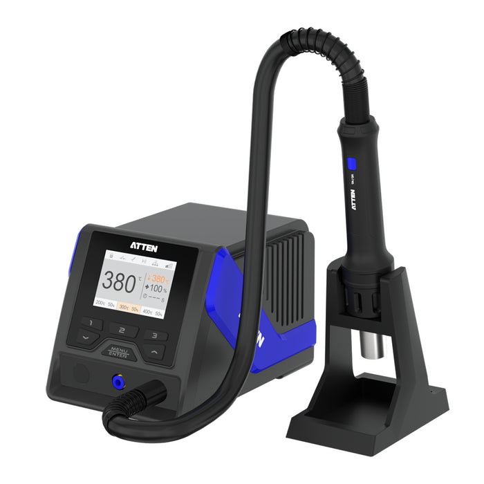 The GT-8100A is a professional intelligent rework station with a high temperature 1300W hot air gun. The station features rapid heat-up and various features including temperature calibration, 3 button shortcuts, IoT function, TFT colour screen and many more. The station is specifically designed for industrial and professional applications including production lines, electronic engineers and various others requiring a high performance hot air station.