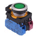 Green button 24V LED illumination 1NO-1NC contacts Screw contact blocks Momentary operation 22.3mm mounting hole IP65 protection level 2.5mm thick bezel 39.9mm depth behind the panel Rating: 120VAC 10A, 240VAC 6A, 8A 24VDC