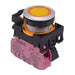 Yellow Button 12V LED illumination 1NC contacts Screw contact blocks Momentary operation 22.3mm mounting hole IP65 protection level 2.5mm thick bezel 39.9mm depth behind the panel Rating: 120VAC 10A, 240VAC 6A, 8A 24VDC