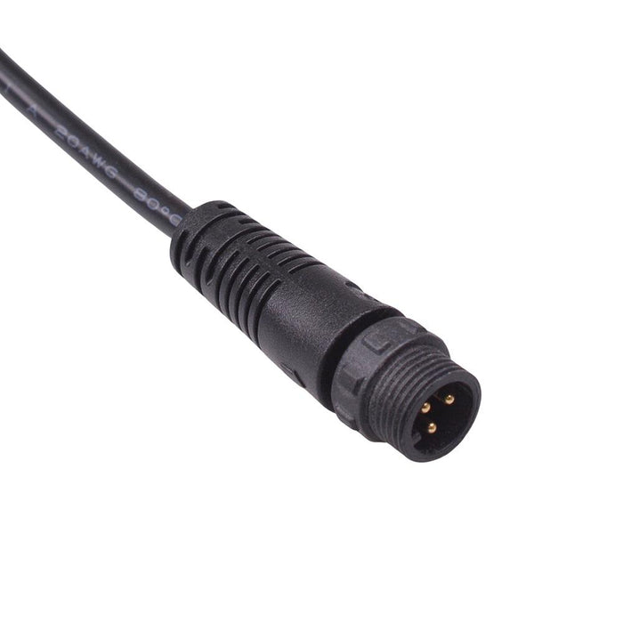 Male 3 pole connectors featuring M12 thread and IP60 protection rating. The connectors feature 500mm tail leads and a locking mechanism providing a secure connection. The connectors are suitable for making low power DC connections including use with lighting.