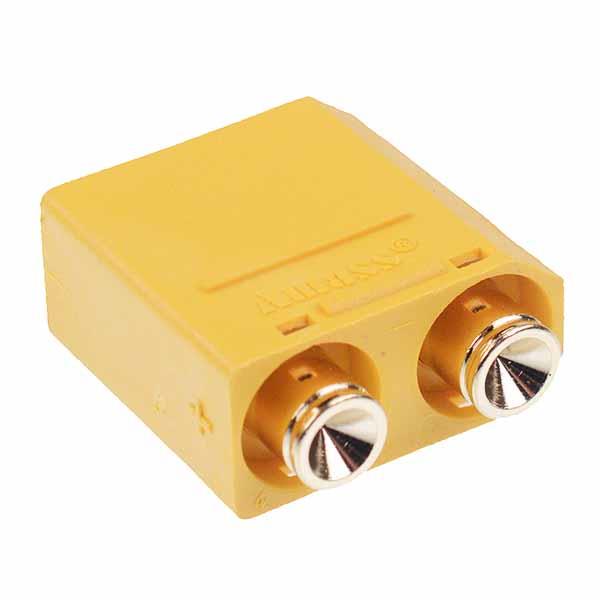 Male XT90PB connector featuring gold plated brass contacts and high temperature nylon housing. The connectors are housed in a compact package and are suitable for PCB lithium battery applications.