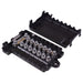 Mega and midi fuse box featuring stud terminals and detachable lid. The box is compatible with a mega fuse up to 250A and 7 midi fuses up to 150A. Suitable for automotive and marine applications.