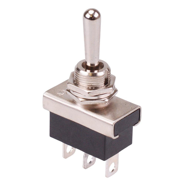 On-Off-On standard size toggle switch featuring SPDT contacts and 6.3mm quick connect terminals. The switches provide a low cost solution for applications including automotive.