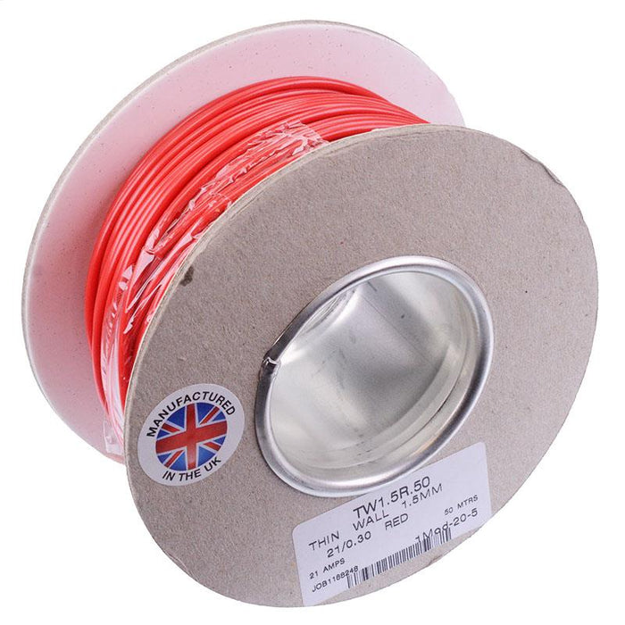 Red thin wall 1.5mm single core cable suitable for low voltage applications including automotive and marine applications. The cable features PVC insulation and provides excellent resistance against petrol, diesel, oil and other corrosive substances.