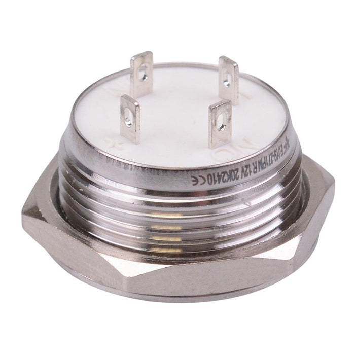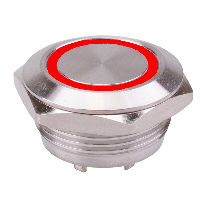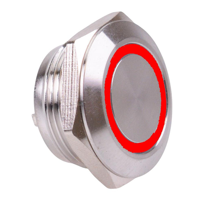 Short body anti vandal momentary push button switch manfuactured from stainless steel, featuring a red LED. The switch features NO / NC contacts and requires a 19mm panel cut-out making it suitable for 12V applications with limited space behind the panel.