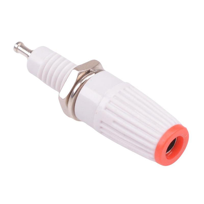 Red 4mm binding post featuring an M8 thread and grey body manufactured from PBT. The binding post features a 2mm cross hole diameter and is suitable for a wide range of test and prototype applications.