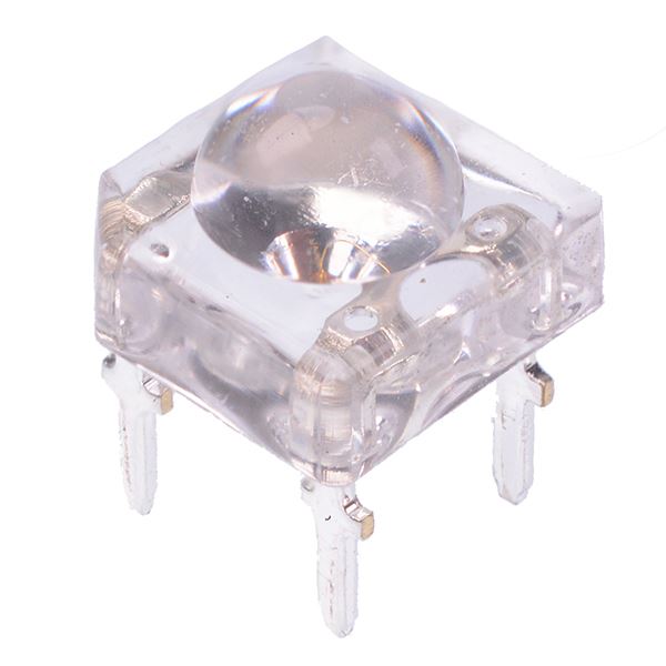 Red superflux LED housed in a 7.6mm water clear square package featuring a 5mm diameter lens providing 1500mcd luminous intensity and low consumption.