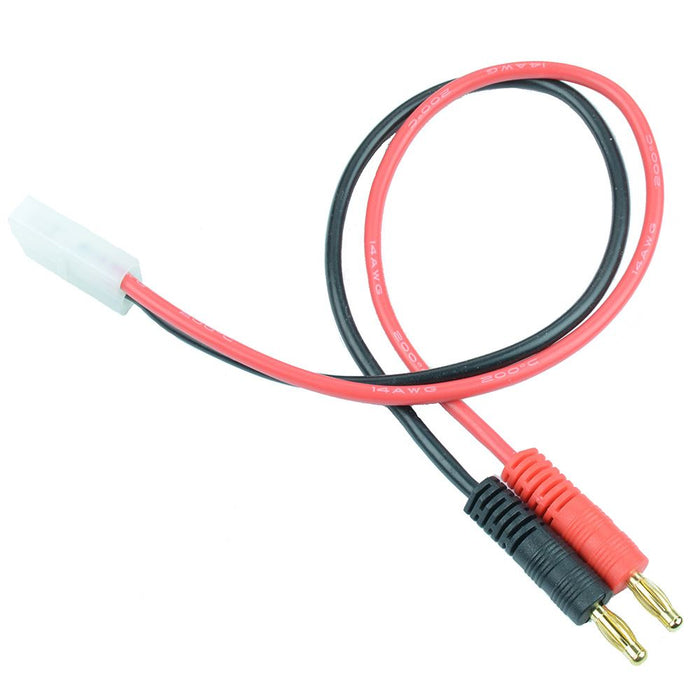 RC tamiya female connector to 4mm gold banana plugs, with 300mm of 14AWG silicone cable.