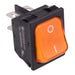 Yellow illuminated rectangle rocker switch featuring DPST contacts and On-Off function. The switch requires a 30.2x22.2mm panel cut-out and features quick connect 6.3mm terminals. The switch is rated up to 16A making it suitable for a wide range of AC applications including appliances and industrial.